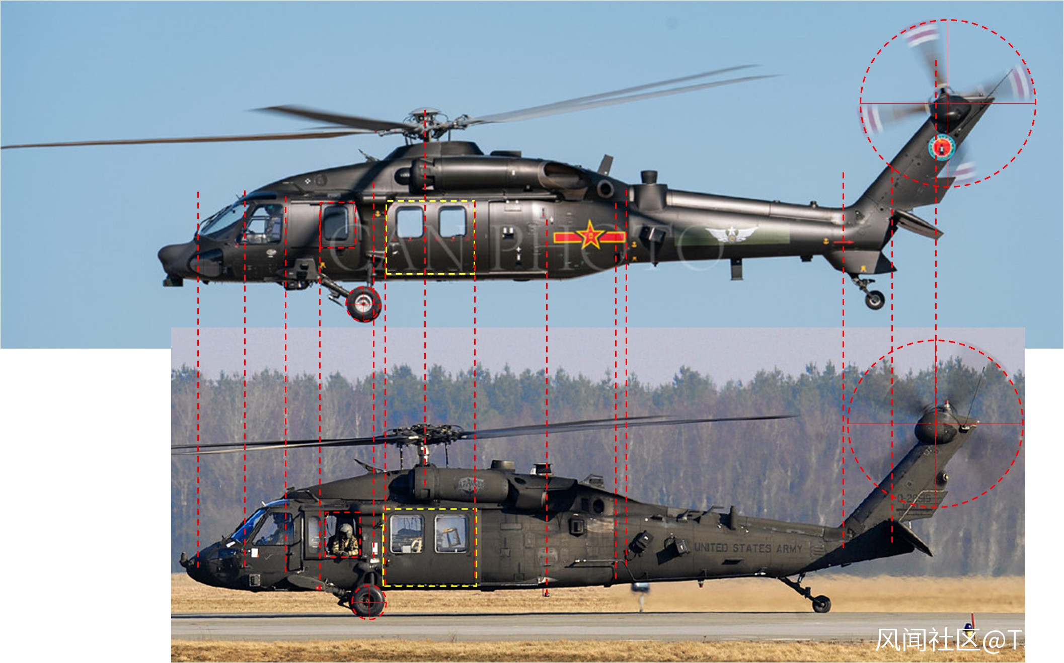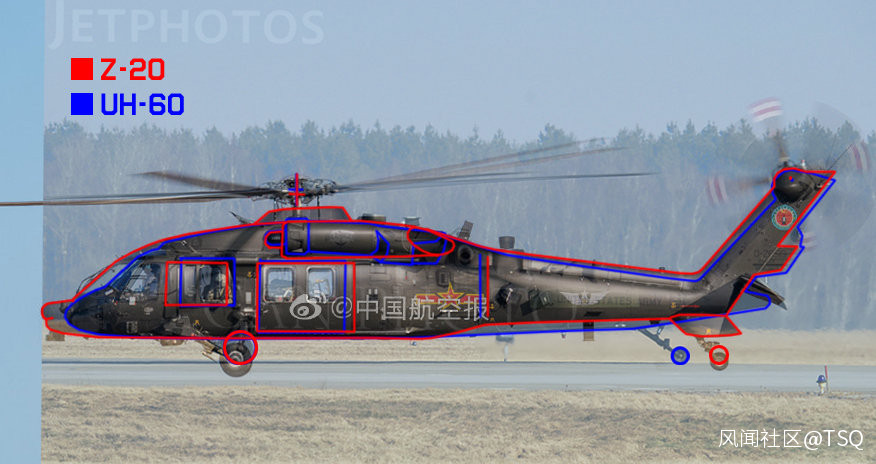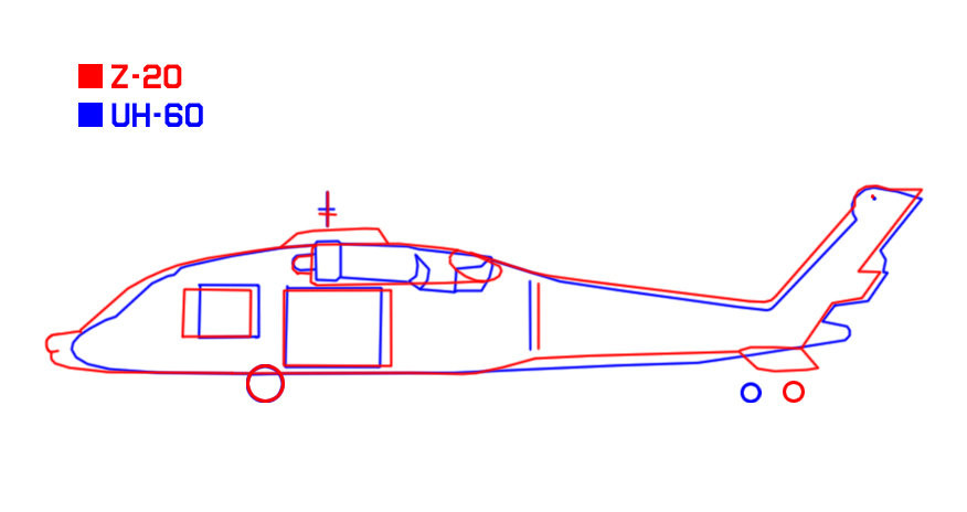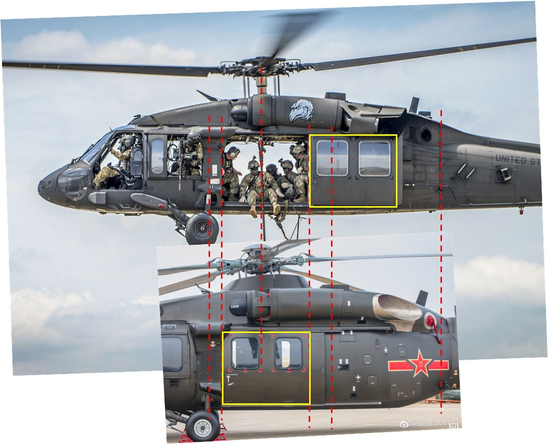 判斷尺寸大小是個比較難的事情,因為兩個機型沒有同框,沒有外部的共同參照物,那如何來判斷大小呢?個人認為可以利用艙門大小來進行判斷。從使用者角度來看,軍隊試用黑鷹已經有足夠長時間,對於黑鷹兩側大艙門的實際使用是有感受的,直20的兩側艙門很難比黑鷹小。基於此,我從把同側面照的黑鷹和直20照片艙門調整到大小相當,然後進行比較。