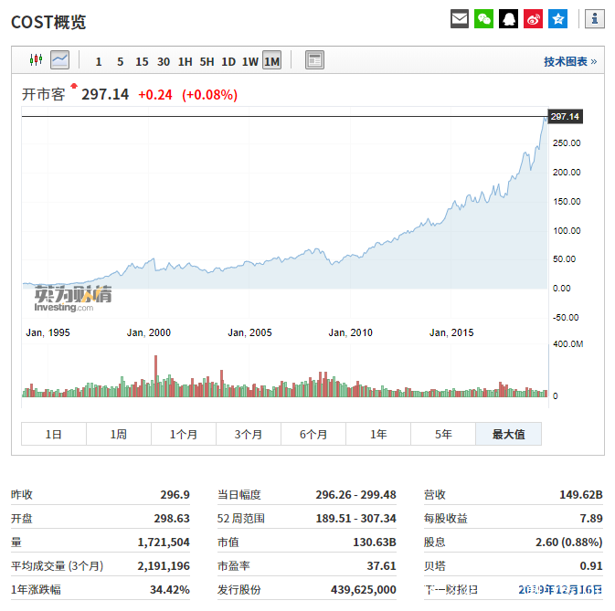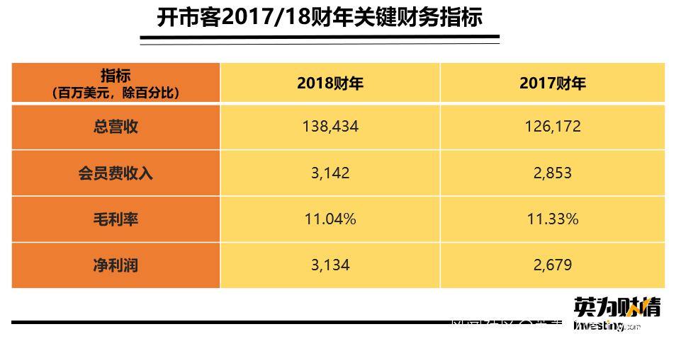開市客2017/18財年關鍵財務指標,來源:英為財情Investing.com開市客的毛利率在11%左右,沃爾瑪相比之下達到了24%左右,是前者的將近兩倍。開市客的出發點,如其創始人所説,是思考“怎麼把一個90塊錢入貨的商品以18塊錢的價格賣出去”。這就延伸出了公司的商業模式:以相對低價銷售商品,將毛利率穩定在11%附近水平,來覆蓋它的運營成本,然後通過收取會員費來賺錢。