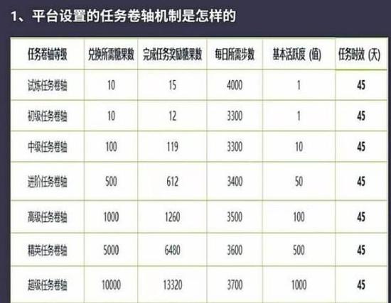 3、 對於有一定資金的用户,可以用“糖果”兑換不同等級的卷軸任務,級別越高收益率越高。譬如10枚“糖果”可以兑換一個初級卷軸任務,在任務有效期內,只要我每天走了3300步,任務期後平台就會發放12枚“糖果”。也就是,存入一定“糖果”,45天就帶來20%收益。