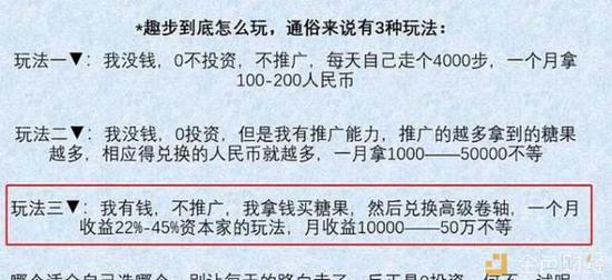 業內人士稱,趣步的模式就是“運動挖礦”,把人拉進去,需要有很多新人進來才能撐住,是金字塔結構,越到後面就要求有越多的人。只有進來新人,上面的人才會有收益。 下圖為網友歸納出的趣步的三種玩法: