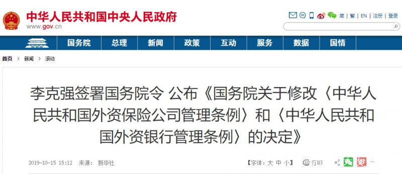 李克強總理簽署國務院令,公佈《國務院關於修改〈中華人民共和國外資保險公司管理條例〉和〈中華人民共和國外資銀行管理條例〉的決定》。