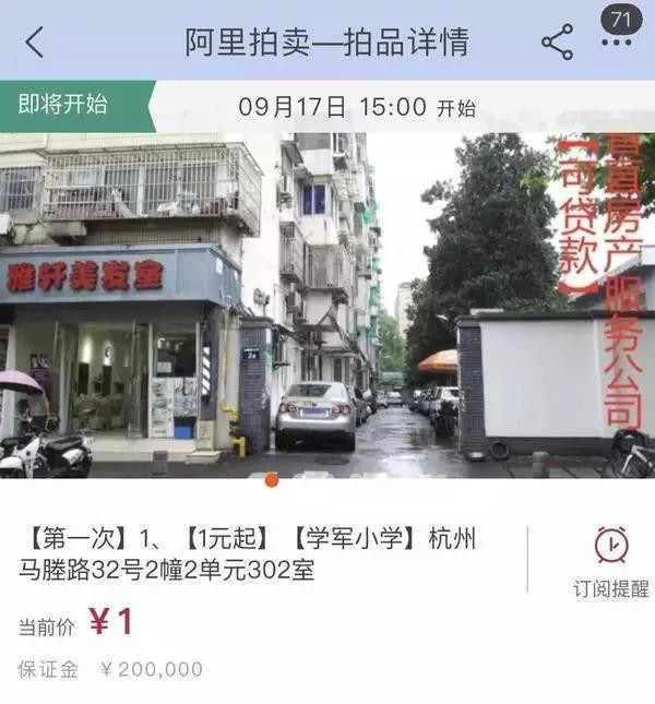 實際上,到阿里拍賣上買房上個月就曾在網上引發熱議。9月2日,淘寶拍賣平台掛出一套杭州學區房。令人大跌眼鏡的是,這套80多平的學區房,起拍價竟然只有1塊錢,並因此引發了多達10多萬人圍觀。