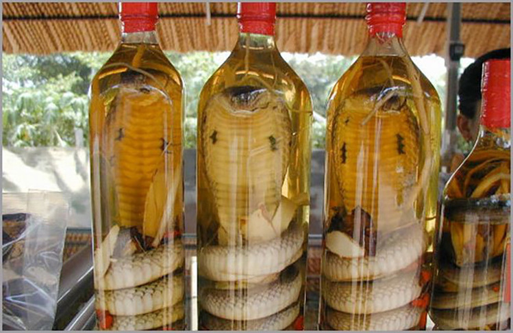 喝蛇酒能治療麻風病的傳説,起源於唐代張鷟的《朝野僉載》:“商州有人患大瘋,家人惡之,山中為起茅舍,有烏蛇墜酒罌中,病人不知,飲酒漸差,罌底見蛇骨,方知其由也。”但烏梢蛇或者四腳蛇泡酒是否真的能治療麻風病,其中醫理何在,則醫書上並無正解,蓋古人治療疑難雜症,往往相信以毒攻毒,所以才有此一説吧。
