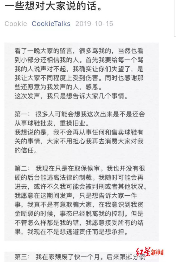 “今天我想向每一位受害者與每一位曾經信任我支持我的人道歉,是我辜負了大家對我的信任,同時我也辜負了很多因為球鞋認識我的人……”