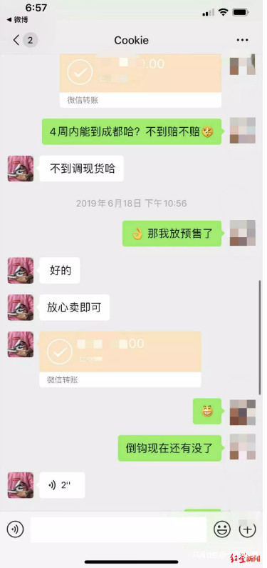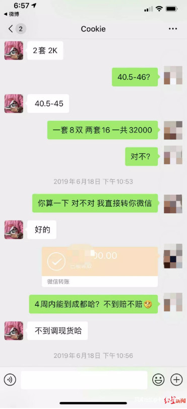 劉女士(化名)是成都人,從她提供的微信聊天截圖來看,6月中旬,劉女士用微信給“劉餅乾”轉賬幾萬元購買了十六雙球鞋,“劉餅乾”承諾鞋子四周內到成都,不到調用現貨。