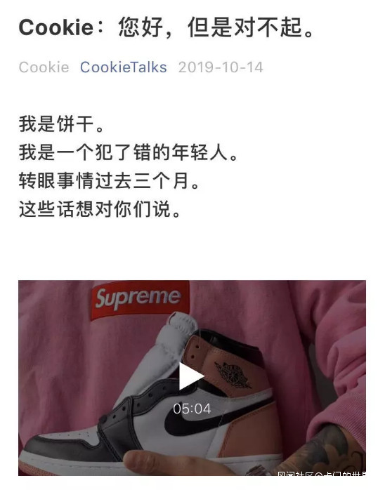 10月14日下午7時59分,一個名為“CookieTalks”的微信公眾號推送了一篇名為《Cookie:您好,但是對不起》的文章,配了一條五分多鐘的視頻。
