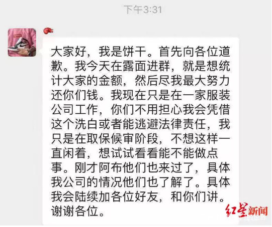 15日下午三點,小湯給記者發送了一個微信截圖,截圖顯示,一位自稱“劉餅乾”的人表示自己要在羣裏統計金額並盡最大努力還錢。“他現在做服裝,背後有大老闆支持。他已經做出回應,大部分受害者同意他現在的補償做法。”小湯告訴記者。