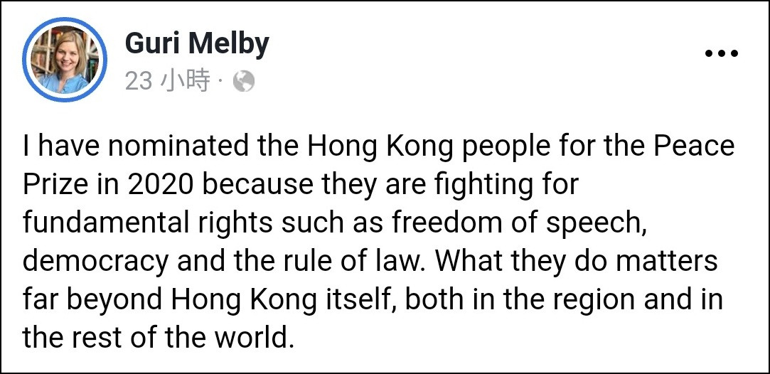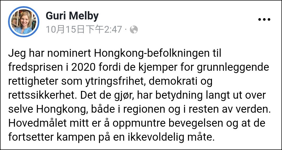像是當地時間10月15日,挪威國會自由黨籍議員Guri Melby就在臉書上發文稱,自己已經提名全體香港人競逐2020年的諾貝爾和平獎。