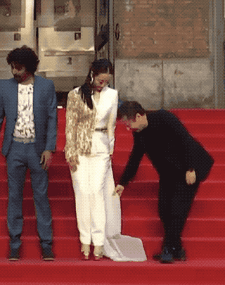 雖然紅毯星光不比戛納,也不比北京上海,但必備節目“我來幫你提裙角”還是有的,很温馨。