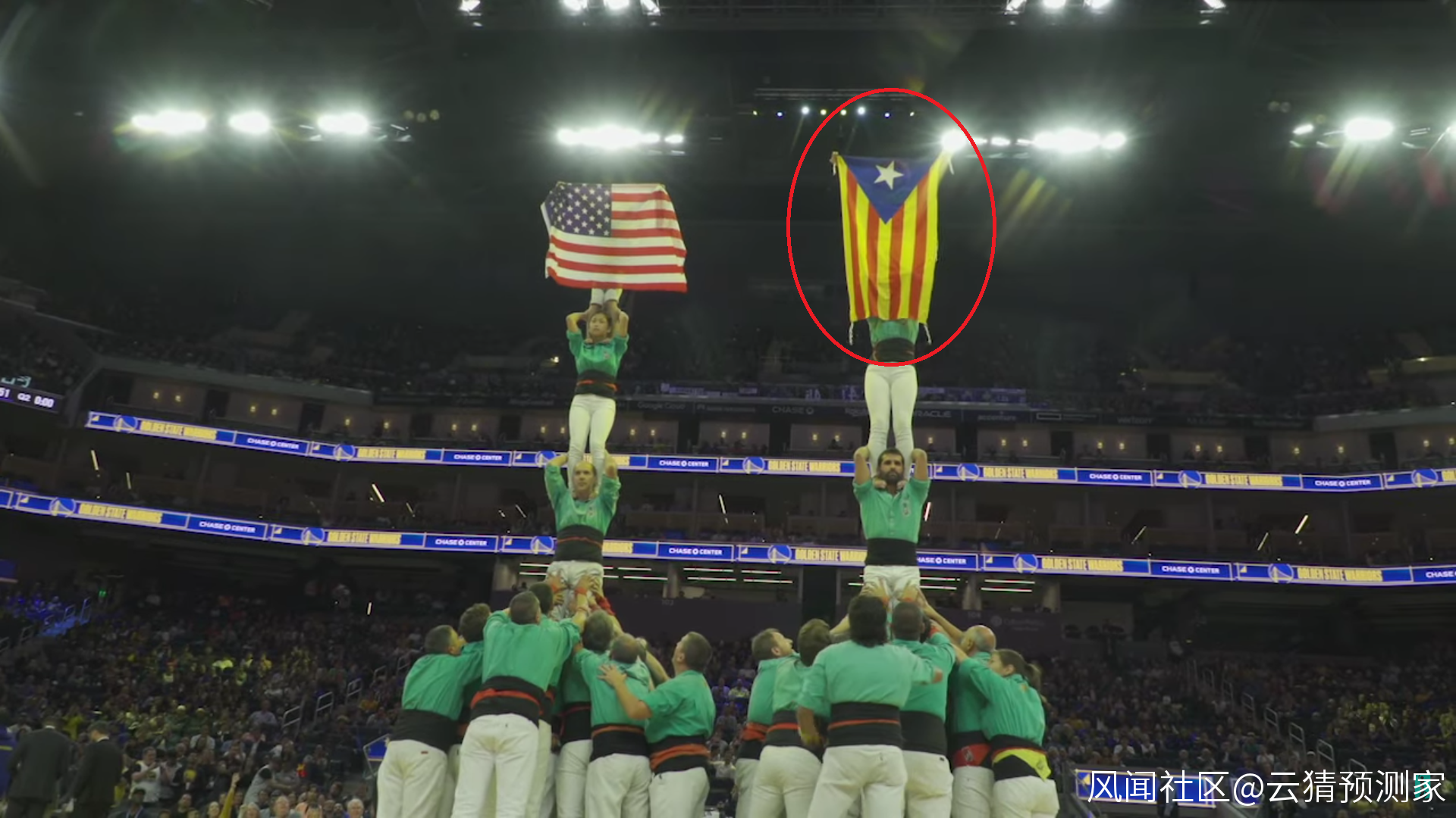這也是為什麼,此前一向對外宣稱支持“民主運動”(月前,德國外長在柏林與到訪的香港鬧事關鍵人物和黑手之一的HZF進行了會面,前者更對HZF獲得保釋表示了歡迎)的歐盟居然玩起了雙標,相對於之前在涉港問題上小動作小言論或者對中國大陸其他地區的“深表關心”、“有所行動”相比,此時的歐盟變得“保守”了起來,完全不顧此前在涉及關鍵屬地時聲稱的“地區自治並非單純內政。”一説,轉而支持西班牙政府出動大量的武裝力量,前往巴塞羅那等地進行針對獨立運動的暴力鎮壓,並協助西班牙在歐盟境內天羅地網式拘捕獨立運動的組織參與者。而西班牙方面,也在歐盟的支持下,向全世界發出針對獨立分子的“國際通緝令”。值得一提的是,彼時的美國財經媒體CNBC稱西班牙和歐盟此舉是“雙重標準”。但在10月10日,在勇士主場舊金山大通中心,NBA勇士隊與森林狼隊比賽現場,一番“疊人塔”在表演結束後公開展示了加泰羅尼亞“獨立”旗幟——“星旗”。這時,整個NBA還籠罩在因莫雷風波而起的迷霧之中。