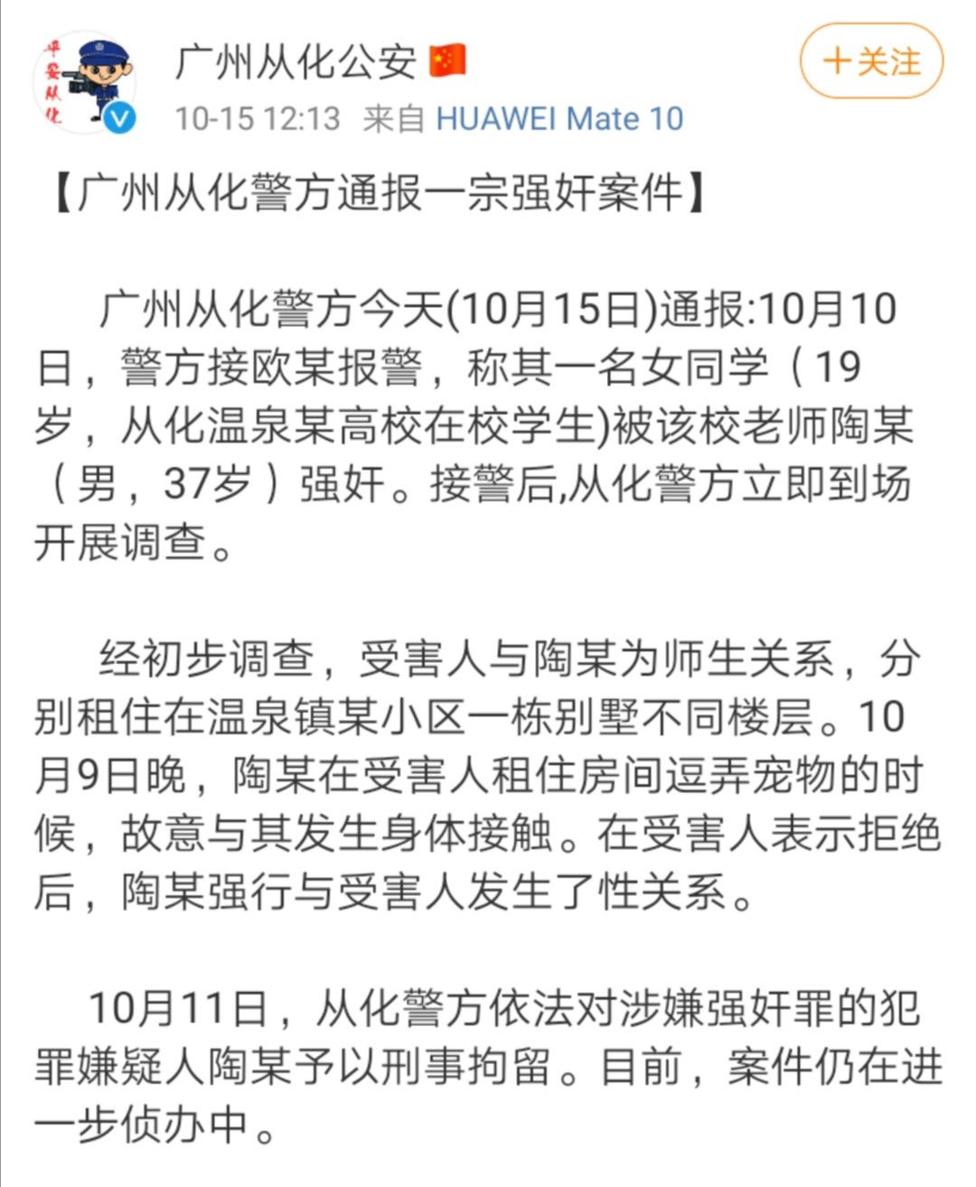 據@廣州從化公安 微博消息,10月11日,警方依法將涉嫌強姦罪的某高校37歲教師陶某刑拘。