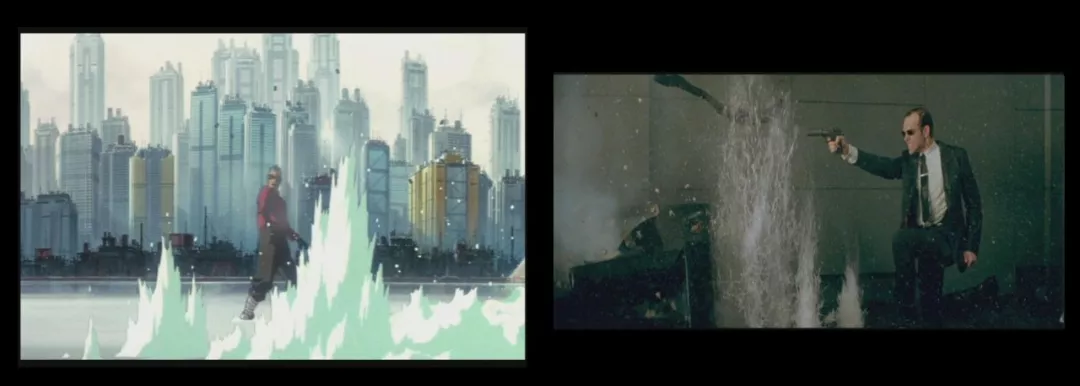 **沃卓斯基兄弟對漫畫和動畫的興趣一直都比較濃厚,《黑客帝國》電影本身就多少有一些來自動畫的靈感。可以肯定的是,沃卓斯基兄弟一定從1995年的《攻殼機動隊》**劇場版中借鑑了一些視覺效果方面的創意,從片頭的綠色字碼、帶着墨鏡的警衞、到類似的槍戰場面,很容易發現連結了這兩部傑作的線索。