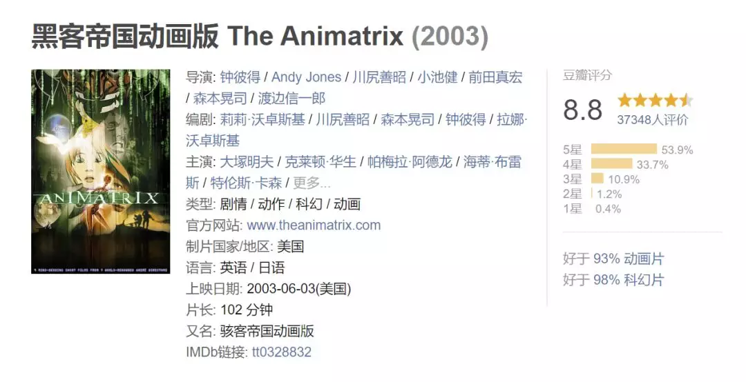 而當1999年,第一部《黑客帝國》大獲成功時,沃卓斯基兄弟的日本之行讓《黑客帝國》投回動畫的懷抱,最終誕生了動畫**《The Animatrix》**。