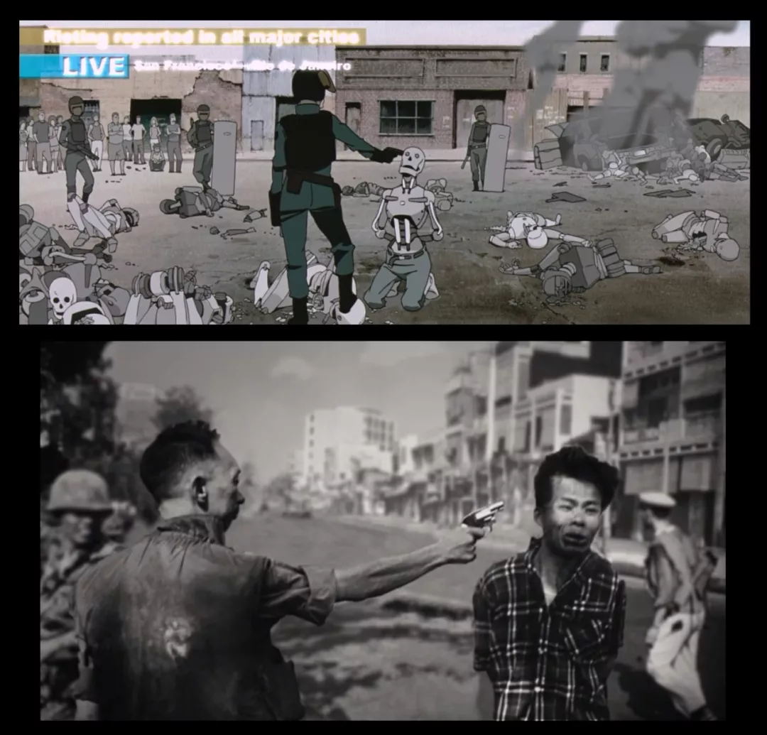 **值得一提的是,****為了讓影片具有一些社會性的深度,前田真宏加入了不少與現實歷史中的事件相似的場面。**比如一個修建巨型建築物的場景,其實非常像類似金字塔的修建過程;而一個機器人被槍決的畫面則明顯在模仿越戰期間一張著名的照片。