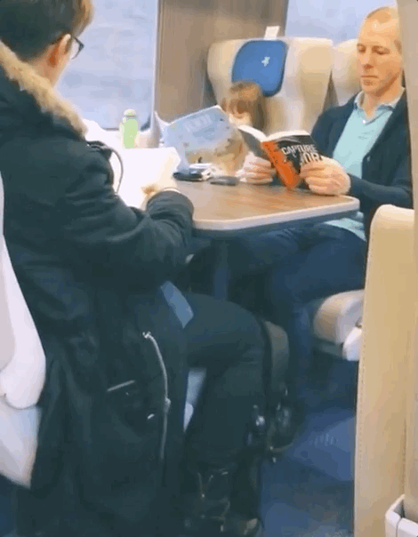 疾馳的列車上,一位帶娃的爸爸正在認真讀書。