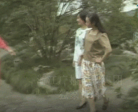 先是倆漂亮女孩兒悠閒地走着,然後視角一轉,左邊小路旋轉來一個明顯飽和度高於整個畫面的look,向你展示八十年代最fa的穿搭: