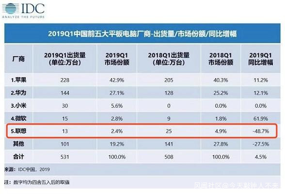 根據IDC公佈的2019第一季度中國平板電腦廠商出貨量數據顯示,聯想平板電腦出貨量暴跌48.7%,排在第五名,市場佔有率為2.4%。