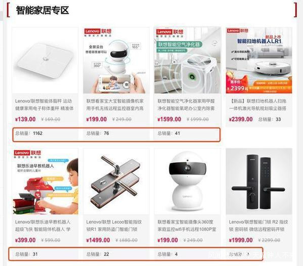 新浪科技查詢了聯想眾多智能產品,例如掃地機器人,在淘寶、京東等平台的銷量尚不足50個,在聯想官方商城中,該產品的累計評論僅維持在個位數。攝像頭、淨化器、智能門鎖等,總銷量也均不足百個。