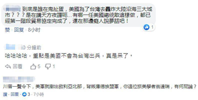 “到底是誰在鬼扯?”有島內網友在《自由時報》臉書相關報道的評論區發出靈魂拷問。他諷刺,美國會為了台灣去轟炸大陸?這是在講天方夜譚呃,有哪一任美國總統敢這樣做?還在那邊痴人説夢。有網友則質問,特朗普一聲令下,美軍撤出敍利亞北部,被判庫爾德盟軍,“你這位旅美學者翁達瑞,有何屁論?”↓