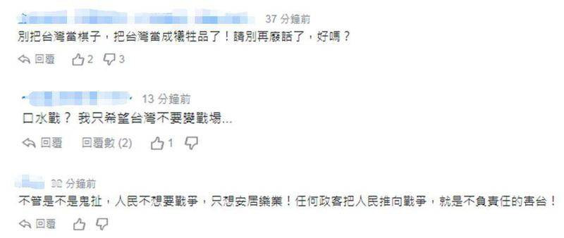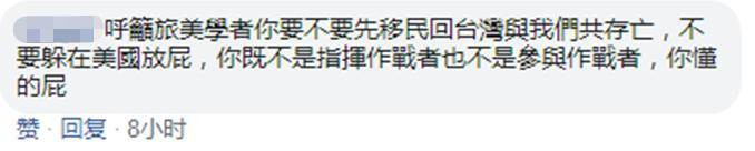 有網友則喊話,呼籲“旅美學者”你要不要先移民回台灣與我們“共存亡”,不要躲在美國“放屁”,你既不是指揮作戰者,也不是參與作戰者,“你懂的屁”。↓