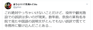 “這是絕對不能做錯的事情啊,但是最近在政府機關和觀光設施中誤譯的情況很多。幾年前,在奈良的某著名寺院看到了錯譯的一塌糊塗的中文説明,我趕緊去找了工作人員……”