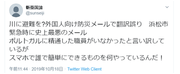 “去河裏避難?面向外國人的防災郵件卻翻譯錯誤。史上最糟糕的避難警報。還用沒有精通葡萄牙的員工作為藉口,明明是在智能手機上誰能簡單做到的東西,都想什麼呢!”