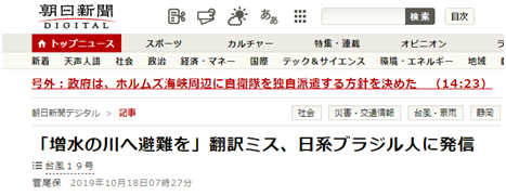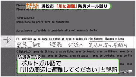 19號颱風“海貝思”日前重創日本,帶來創紀錄暴雨,截止目前已造成近80人死亡。颱風來時,日本各級政府紛紛向市民發佈避難警報。因濱松市駐有大量外國人,該市則用外語向他們發送警報。不料,其中發佈的葡萄牙語版本竟是:請立即到河裏避難!據悉,該警報大約傳送了700人,還連續發送了兩遍。對此,濱松市給出的解釋也令人瞠目結舌:翻譯沒在,機器翻的……