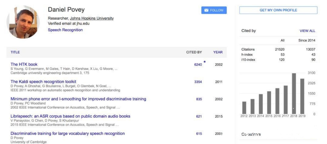 Dan Povey,英國人,2013年博士畢業於劍橋大學,之後分別在2013年和2018年加入IBM和微軟,研究計算機語言識別技術,2012年加入約翰霍普金斯大學,擔任助理研究教授,在這期間,他發表了不少關於語言識別的研究成果,據Google Scholar上的數據顯示,其論文被引用了2W多次。