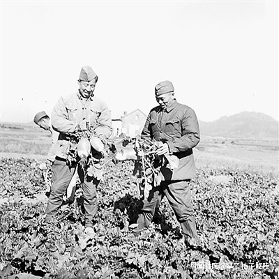 瀋陽軍區司令員鄧華上將(右)在連隊菜地收蘿蔔。