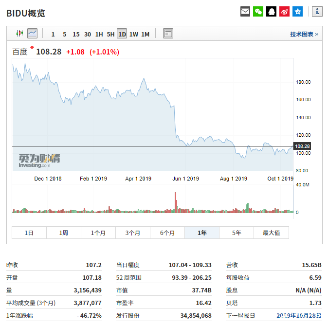 百度是今年迄今納斯達克100指數表現第二差的成分股,累計跌幅31.73%,僅次於令股神巴菲特“踩雷”的昔日食品巨頭卡夫亨氏 (NASDAQ:KHC)。自5月份公佈了上市以來首份虧損的財報之後,百度股價一直萎靡不振。過去12個月,其股價將近腰斬,市值被美團 (HK:3690)、京東 (NASDAQ:JD)、拼多多 (NASDAQ:PDD)超越。