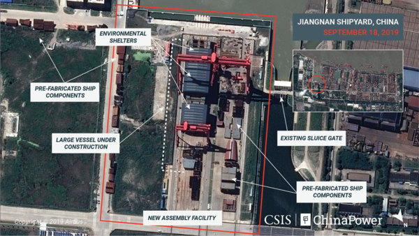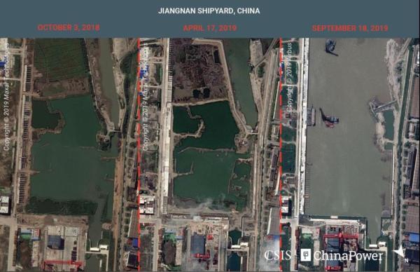 上圖是《ChinaPower》今天發表的新衞星圖,比較了江南造船厰一個新港池在過去這年的施工進展。該文(參見 https://chinapower.csis.org/china-carrier-type-002/)作者認為這是為未來幾年加速建造航母所做的準備。當然,實際上我們還不能確定未來中國航母的建造步驟和地點,只能根據既有的公開資訊來討論018號(在上圖右下角,鐵灰色屋棚下;目前已有一長一短兩座龍門吊)本身的進展。