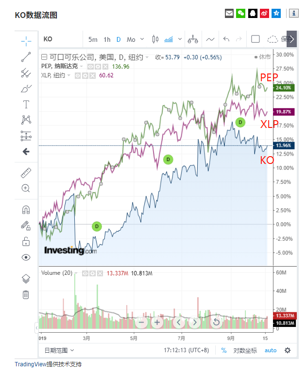 可口可樂、百事可樂和消費品板塊走勢對比,來自英為財情Investing.com關注點一:可口可樂對於後市的預期