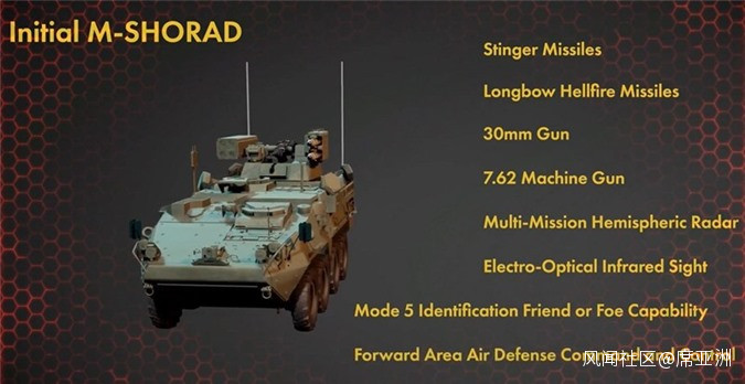 據美國《防務新聞》報道,在最近的美國陸軍協會年會(AUSA)上,美國陸軍展示了他們即將大批量採購的IM-SHOARD防空車,這種採用“斯特瑞克”底盤的裝甲車上安裝4組lenardo公司的相控陣雷達天線,車上安裝一個轉塔,有7.62毫米機槍,30毫米M230機關炮,4聯“毒刺”和2枚AGM-114“海爾法”導彈。