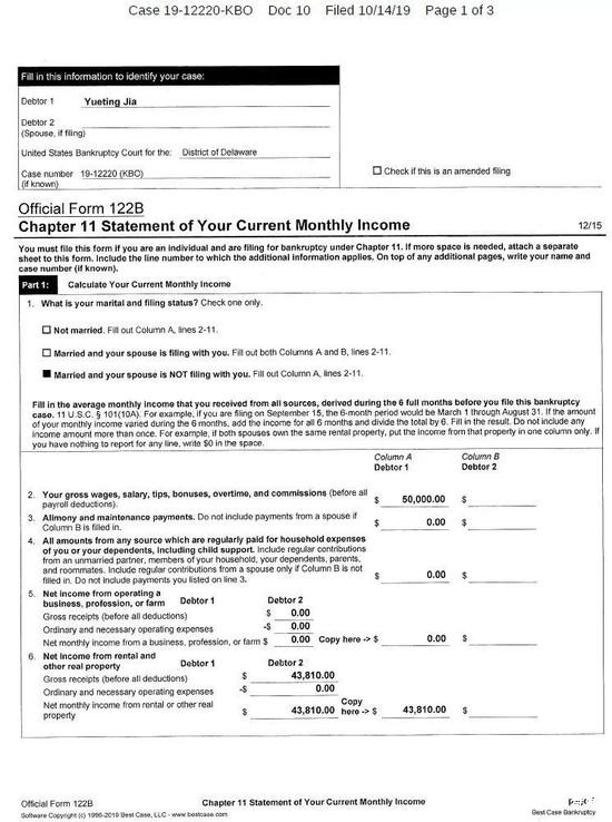 破產公司文件和申請管理公司Epiq Cases網站披露的一份文件顯示,賈躍亭在10月14日提交破產申請文件前6個月,每月的月收入為93810美元。