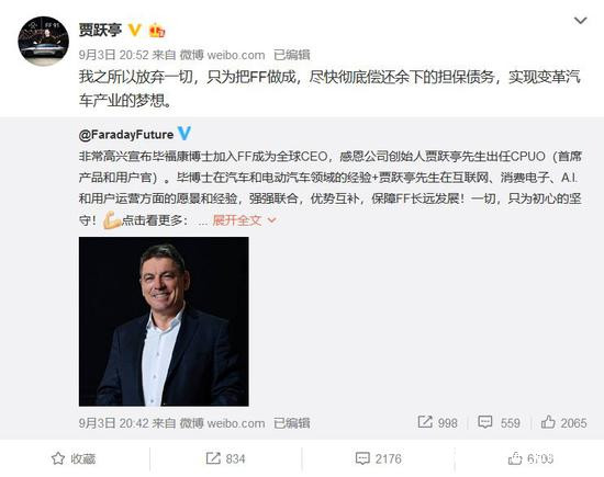 值得注意的是,9月3日法拉第未來(以下簡稱FF公司)宣佈任命畢福康博士(Dr。 Carsten Breitfeld)為全球CEO。同時,賈躍亭將辭去原CEO職務,出任CPUO(首席產品和用户官)。