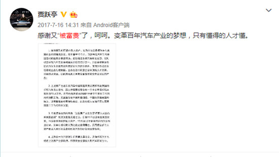 當時賈躍亭也在微博發文澄清稱“被富貴”,澄清中稱,上述房產“是樂視汽車中國高管來美出差和常駐美國的樂視汽車員工住所,因工作需要經常會有一二十名中國樂視高管輪流在LA工作,在節約出差成本的同時也便於在美員工與國內的協同工作,尤其是存在中美時差問題,中國白天是美國的晚上,通常需要中美視頻會議,此處也成為樂視汽車生態美國第二工作點和會議室”。