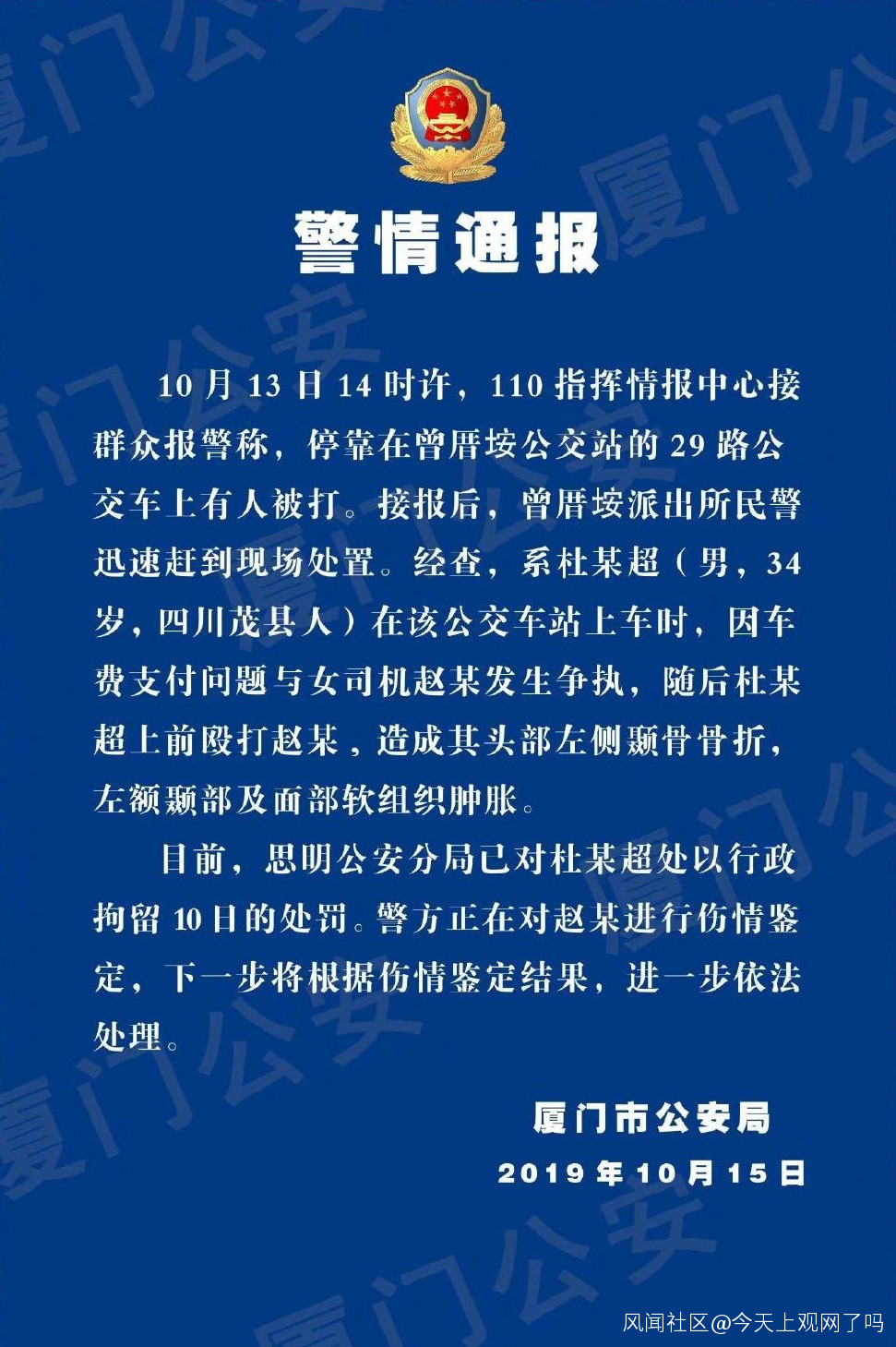 10月13日,廈門29路公交車上,一男子因車費支付問題與女司機起爭執,隨後突然掄拳暴打女司機,還掐住女司機脖子,將其拖出駕駛室毆打。@廈門警方在線 通報稱,女司機頭部左側顳骨骨折,男子最終被行拘10日。