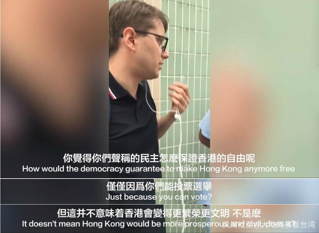 其中有一則視頻顯示,他與一名蒙面的香港青年對話,更為直接地揭穿了示威者的虛偽一面。