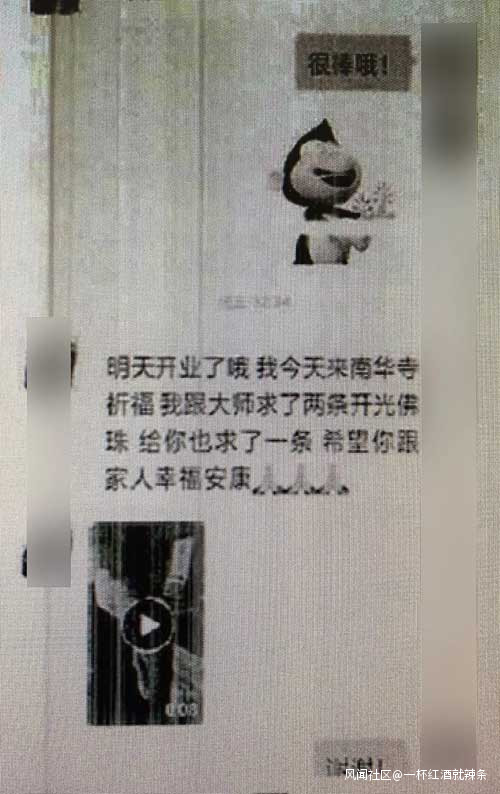 27日,小桐説要去廟裏為新店開業祈福,接着就發了在寺廟祈福的視頻過來。她還問小偉要了電話和地址,説是給小偉求了串佛珠,要寄給他。為表示感謝,小偉給小桐發了一個微信紅包,並祝她開業大吉。小桐不肯收,而讓小偉在第二天,即開業當天早上的10點10分再發,以此討個“十全十美”的彩頭。