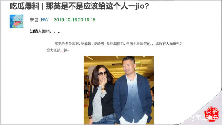 微博截圖打開後發現,是一位名為NW的網友所發的多張不知何出處的“關於那英老公孟桐發家史”的文章截圖。而在最早發佈的文章下面,這位NW網友還與多位網友進行了互動,並表示“新實錘瓜,知情人爆料,歡迎吃!”、“是真的”、“這是他發小跟他吃飯的時候他本人自己説的”、“年輕的時候還可以應該,有時候不一定只有帥才能被包養啊”。這位網友還表示“因為文字發不出來啊。。。只能截圖”。