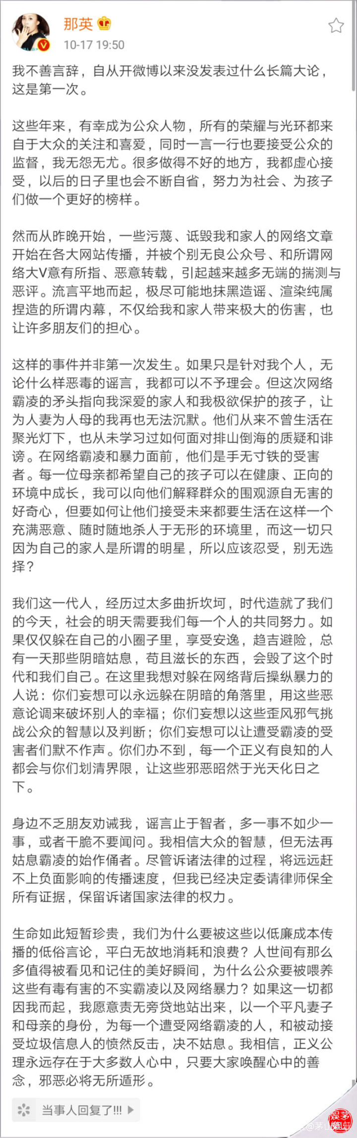 微博截圖原來,17日晚19:50分,歌星那英在微博上發了一篇長達1001字的微博,在長博裏她説自己不善言辭,所以從開博以來沒發表過長篇大論,這是第一次髮長文,因為“從昨晚開始,一些污衊、詆譭我和家人的網絡文章開始在各大網站傳播,並被個別無良公眾號、和所謂網絡大V意有所指、惡意轉載,引起越來越多無端的揣測與惡評。”她還説“相信大眾的智慧,但無法再姑息霸凌的始作俑者”,於是決定請律師,保留訴諸法律的權力。