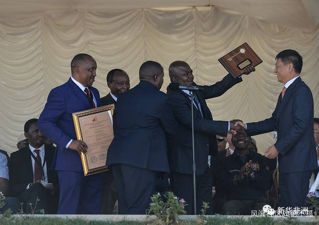 10月16日,中國路橋黨委書記、董事長盧山在內羅畢-馬拉巴標軌鐵路(內馬鐵路)一期工程通車儀式上與肯方交接。新華社記者 李琰攝
