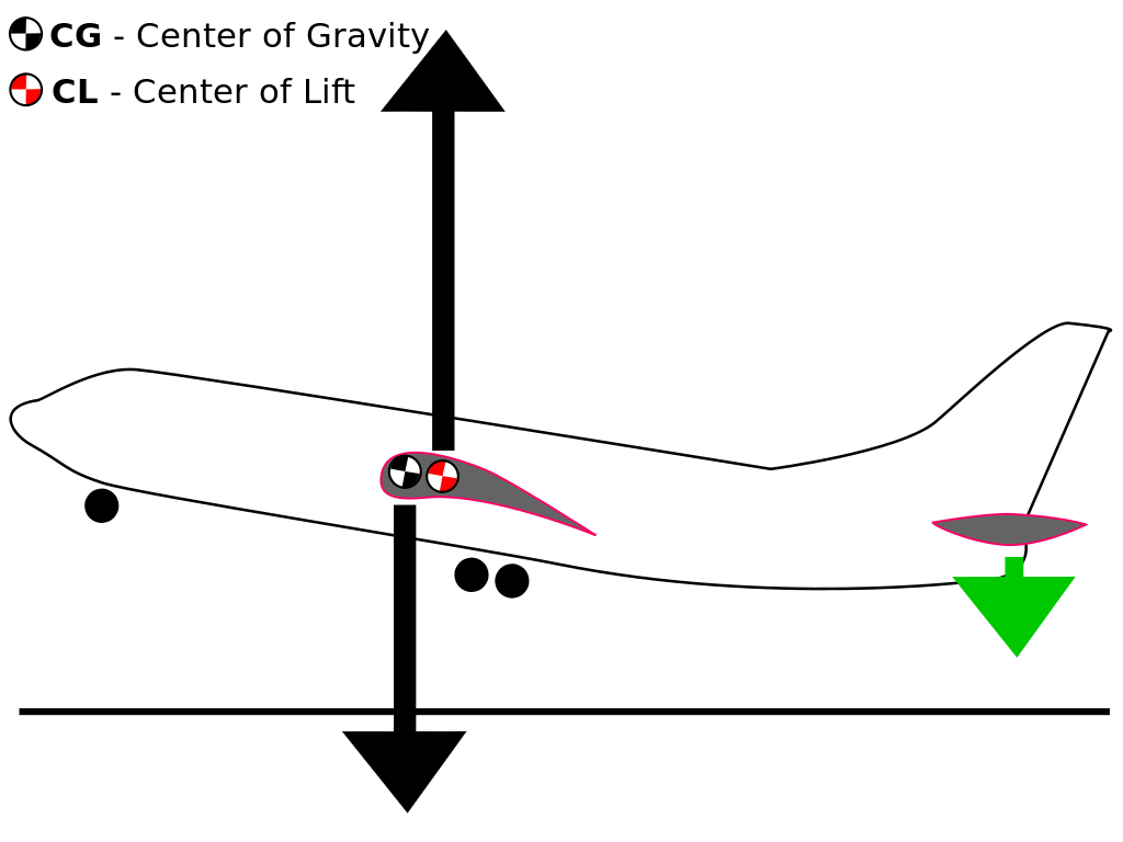 氣動穩定性可以用重心(黑色)和升力中心(紅色)的相對位置來説明,重心在前為靜穩定的。綠色箭頭顯示的是配平力矩