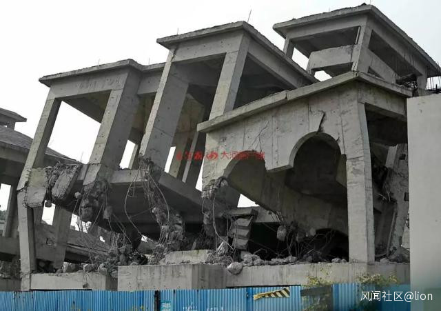 破敗的藍色圍擋之後,就是此前的別墅羣和五星級酒店,別墅區分為東西兩部分,由一條小路隔開,西片區別墅此前為水泥框架結構,此刻在破拆機械的作用下,早已經樓塌柱斜,鋼筋外露,全部為完工的別墅框架均被破拆機械進行初步破拆,偌大的工地現場,五六台破拆機械只有兩台正在作業,其餘車輛工人尚未到位,兩輛降塵霧炮車也在現場,同時進行破拆的霧炮降塵作業。