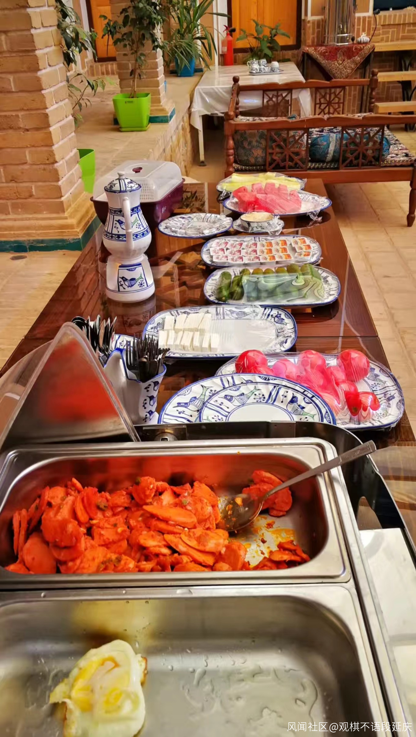 免費早餐,是在 伊朗 民宿中最好的,有餅、煎雞蛋、奶酪、黃瓜、西紅柿、炒腸、西瓜、 哈密 瓜和熱紅茶,超讚!