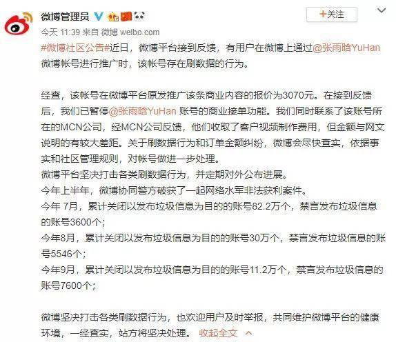 公告稱,微博平台堅決打擊各類刷數據行為,並定期對外公佈進展。歡迎用户及時舉報,共同維護微博平台的健康環境,一經查實,站方將堅決處理。