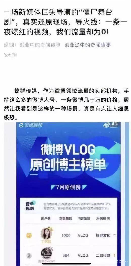 14日,一篇名為《一場新媒體巨頭導演的“殭屍舞台劇”,真實還原現場,導火線:一條一夜爆紅的視頻,我們流量卻為0!》的微信文章發佈,隨後刷屏朋友圈,作者自稱青年創業者,痛斥微博領域流量機構蜂羣文化旗下某美妝博主刷量騙取其推廣費用。