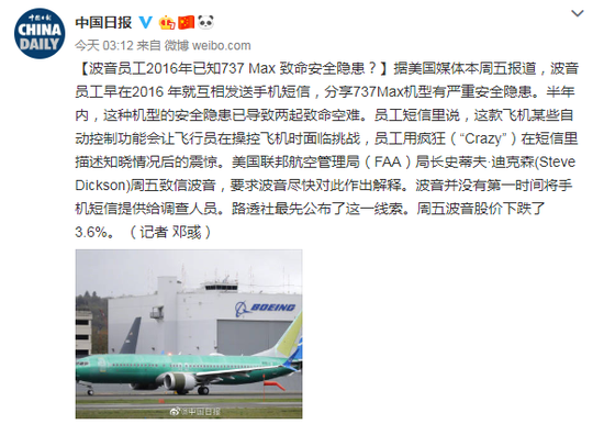 波音員工2016年已知737 Max 致命安全隱患?來源:中國日報微博