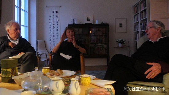 諾貝爾文學獎得主托馬斯·特朗斯特羅姆 (左)與妻子莫妮卡(中)、朋友馬悦然(右)在家中,牆上掛着一幅書法。