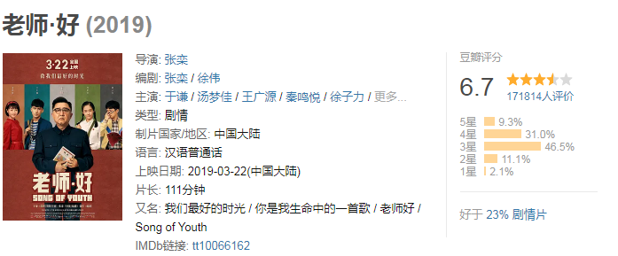 故意為之的台詞,一定要生病的學生和免不了的車禍也一度讓我覺得很膈應,但是這依然不影響我認為這是一部值得去看的電影。而推薦的原因恰恰是因為這部電影是一篇“流水賬”,因為它的流水賬,我們得以有機會以“電影”為一個引子,去反思我們教育事業中存在的問題。